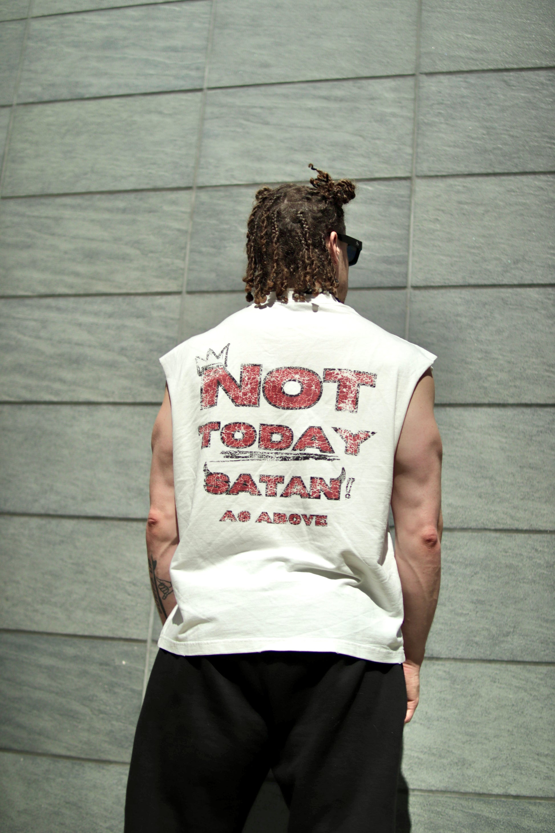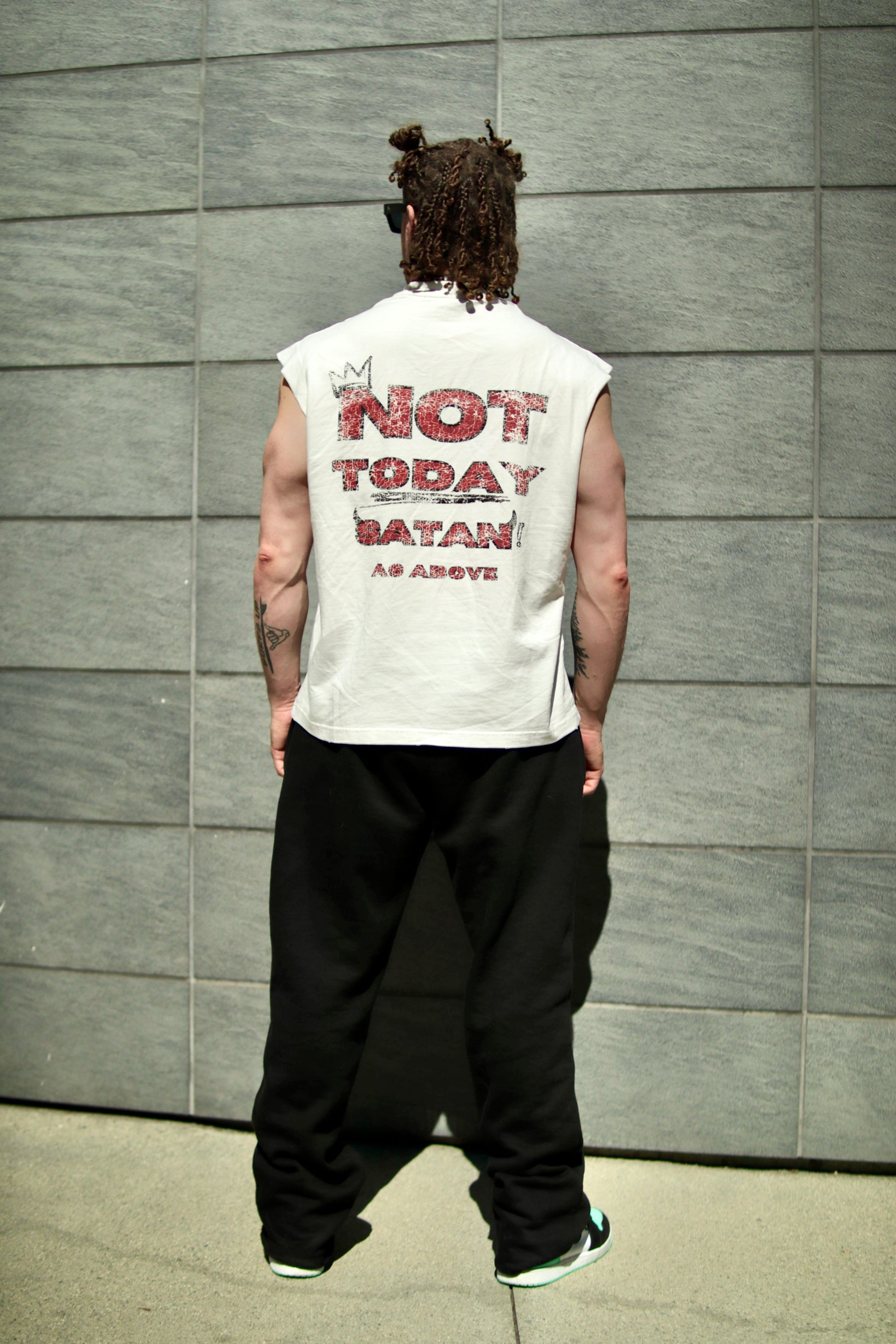 Elevate your streetwear game with a choice of 3 different As Above Not Today Cut-Off Tank Tops, boasting a bold distressed-effect print. This tank top embodies a lifestyle streetwear vibe, perfect for making a statement on the go. Crafted From French Terry cotton for comfort and mobility, .